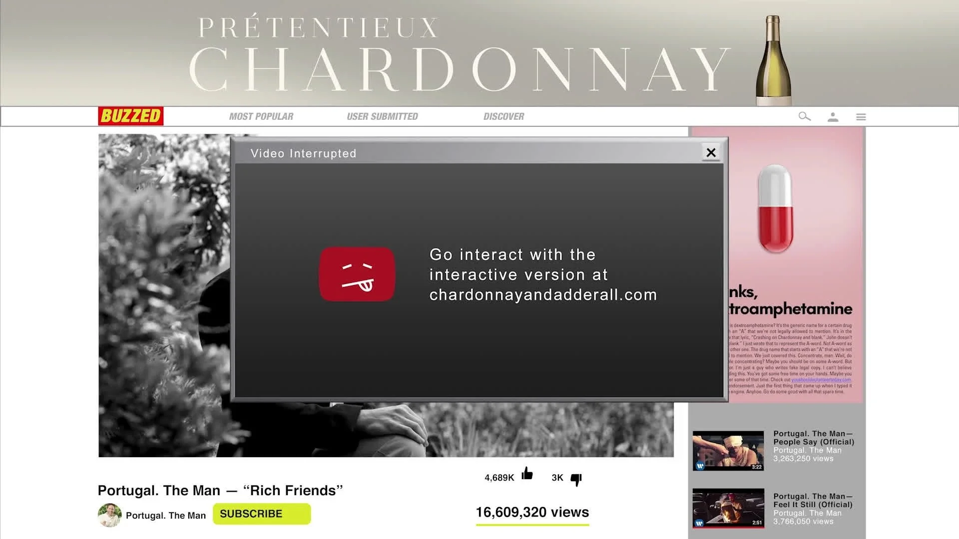 Somehow, we convinced Always Sunny’s Glenn Howerton and his wife to star in the downward spiraly-est video ever. Faux pop-up ads made their relationship seem perfect. But rolling the cursor over each pop-up revealed the dark truth. Thrillist called it one of the best music videos of the year. Thanks Thrillist. Check out the interactive video at chardonnayandadderall.com or non-interactive version below.